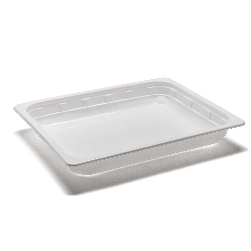 Contenitore formato 1/2 Gastronorm in polipropilene, altezza 40 mm, termosaldabile e idoneo al contatto alimentare. Ideale per caseifici, gastronomie e cucine professionali.