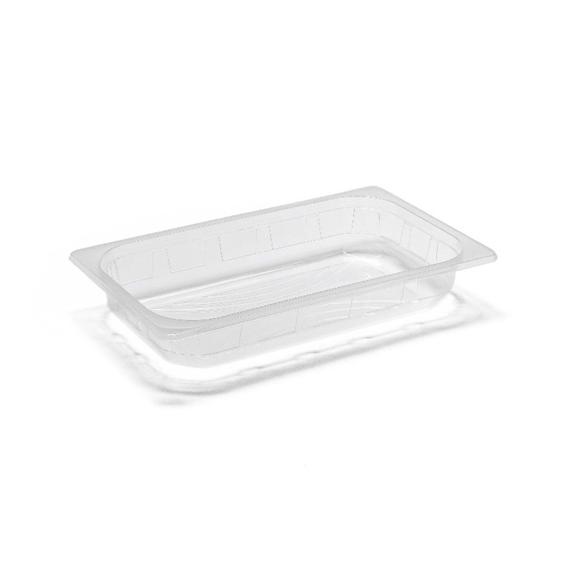 Contenitore formato 1/4 Gastronorm in polipropilene bianco, altezza 50 mm, termosaldabile e idoneo al contatto alimentare. Ideale per porzionatura e conservazione di prodotti caseari e preparazioni gastronomiche.