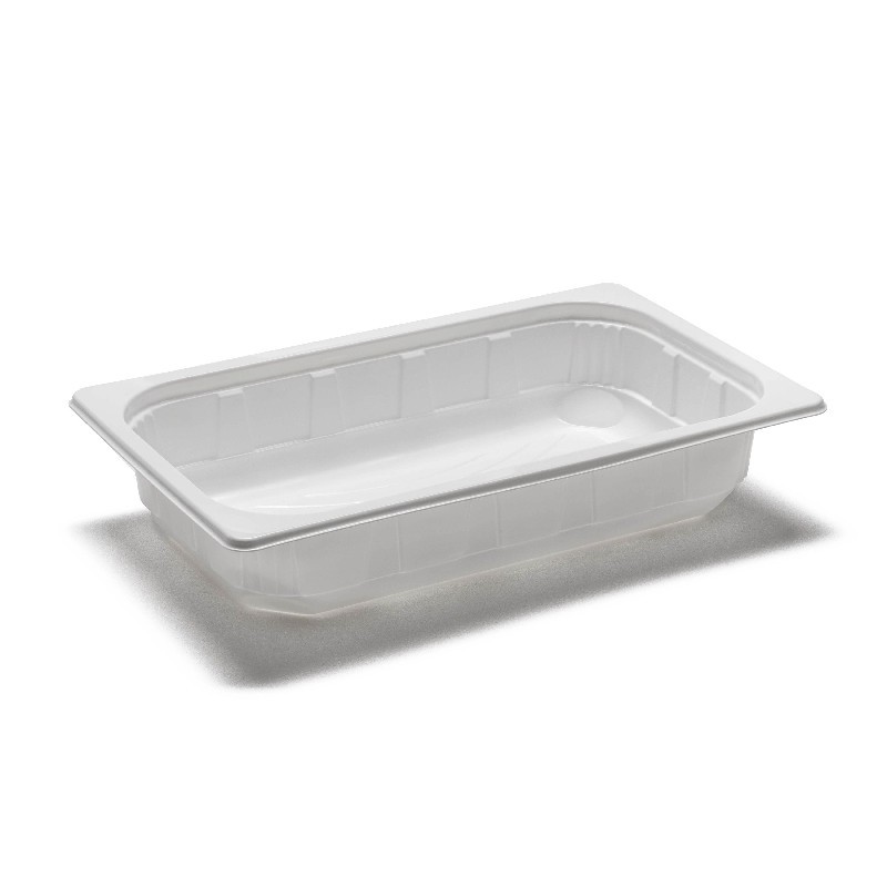 Contenitore formato 1/4 Gastronorm in polipropilene bianco, altezza 50 mm, termosaldabile e idoneo al contatto alimentare. Ideale per porzionatura e conservazione di prodotti caseari e preparazioni gastronomiche.